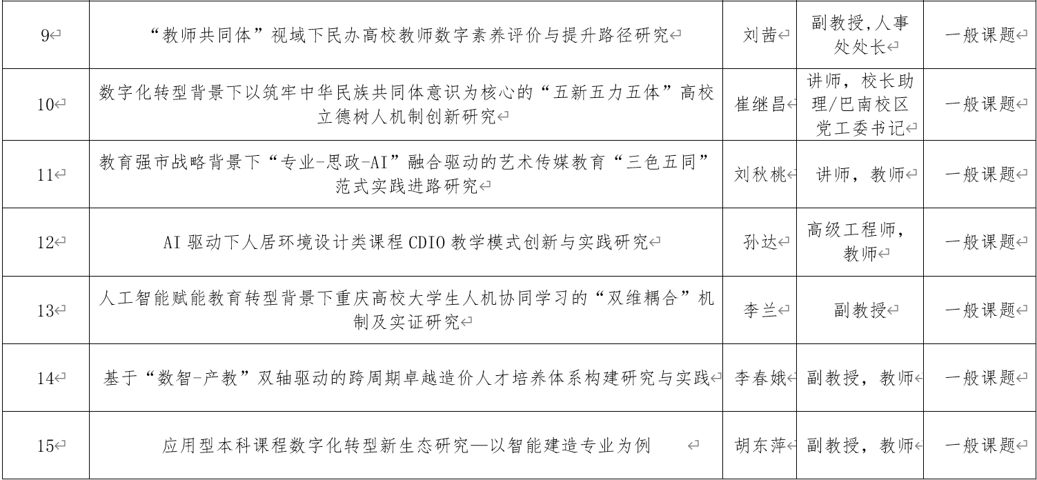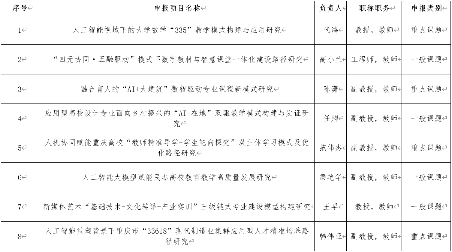 根据《重庆市高等教育学会关于开展2025-2026年度高等教育科学研究课题立项工作的通知》(渝高学会发〔2025〕6号)文件精神,学校积极组织申报,经教师申报、二级学院推荐、资格审查、专家评审和学校审定,拟推荐《人工智能视域下的大学数学“335”教学模式构建与应用研究》等15个项目申报重庆市高等教育学会2025-2026年度高等教育科学研究课题,现予公示。