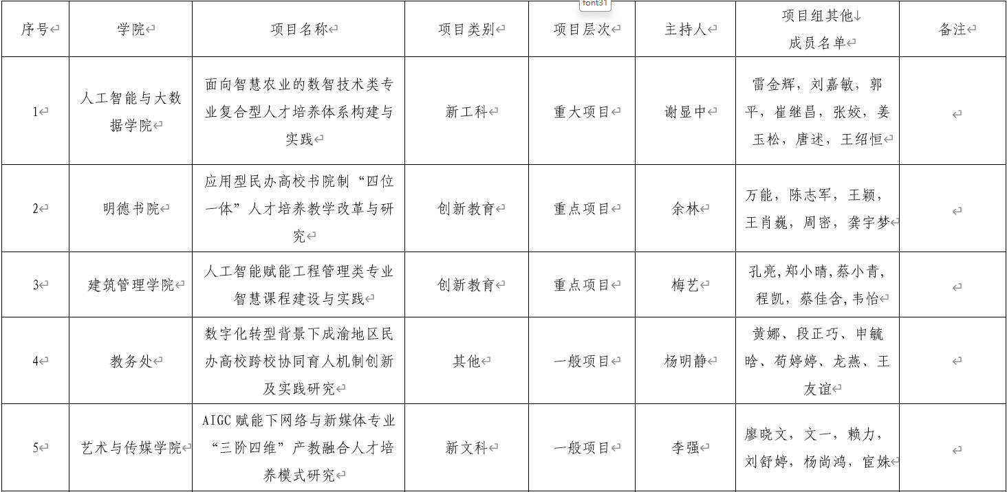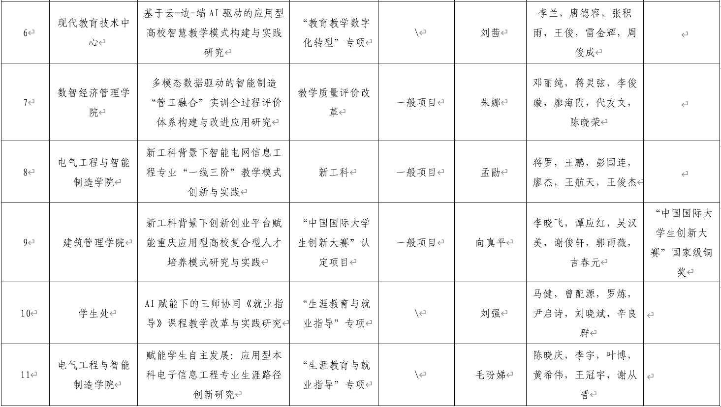 为深入推进我校高等教育教学改革,提升教育教学质量,培育优秀教学改革成果,根据《重庆市教育委员会关于开展2026年高等教育教学改革研究项目申报工作的通知》(渝教高函〔2026〕25号)、《重庆城市科技学院关于开展2026年高等教育教学改革研究项目申报工作的通知》(重庆城科发〔2026〕56号)文件通知,经教师申报、二级学院推荐、资格审查、专家评审和学校审定,拟推荐“面向智慧农业的数智技术类专业复合型人才培养体系构建与实践”等11个项目(含“创新大赛”认定项目)申报重庆市2026年高等教育教学改革研究项目,现予公示。